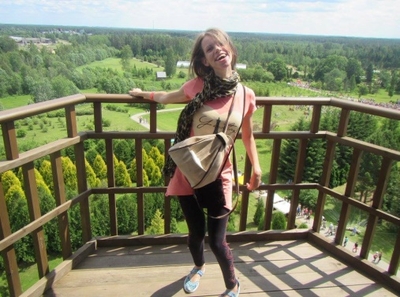 Mēs ar Jāni kāpām tik augšā. Virsotne sasniegta. Skats, vienkārši brīnišķīgs: cik skaisti izskatās lauki un dārzs no augšas, vienkārši lieliski, kā pasakā! Jutos ļoti laimīga.